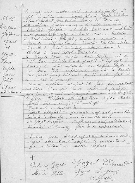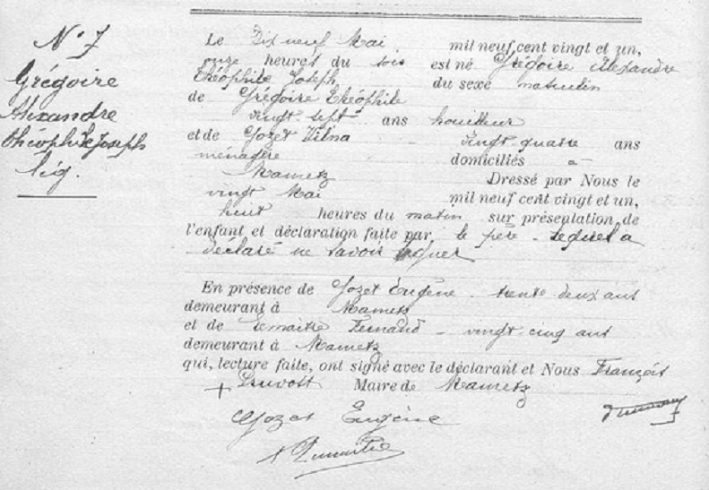 Le père d’Alexandre, Teófilo Gregório, membre du Corps Expéditionnaire Portugais (CEP), a été soldat au sein du C.A.L.P. Il est né à Santa Maria do Castelo (Torres Vedras), fils de Camilo Gregório e Suzana de Jesus. Teófilo Gregório s’est marié avec Gozet Vilna le 25 octobre 1920. Notons que, dès l’acte de mariage établi par la Mairie de Mametz, les noms portugais ont été francisés, Teófilo Gregório devient Théophile Grégoire.