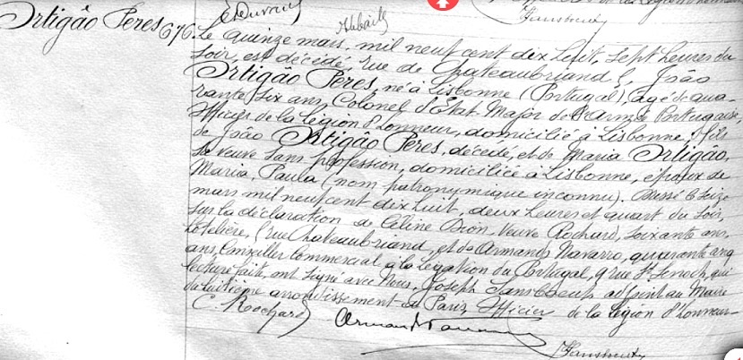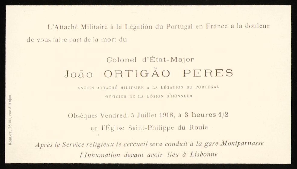 Le Colonel d’État-Major, cité plus haut, João Ortigão Peres est décédé pendant la Guerre, le 15 mars 1918, à l’âge de 46 ans, à son hôtel rue Chateaubriand. Ce décès interroge. Il était Directeur, de 1913 à 1915, de l’Institut des élèves de l’Armée portugaise. Dit «étranger», il avait été nommé Chevalier de la Légion d’Honneur le 17 novembre 1909. C’est Armando Navarro, Conseiller commercial à la Légation qui avait déclaré le décès. Les obsèques ont eu lieu le 5 juillet 1918 à l’église du 8ème arrondissement parisien. Pourquoi ce délai de plus de 3 mois ? Le Capitaine du CEP Vasco de Carvalho, Attaché militaire adjoint, faisait partie de l’assistance. L’inhumation a eu lieu à Lisboa, la dépouille mortuaire passant par Brest.