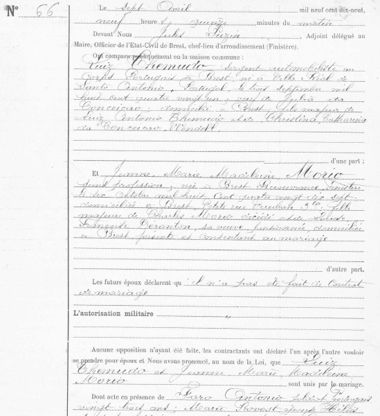Marie Provost épouse Héliès, dite plus tard «la mère des soldats portugais» (lire ICI) est témoin du mariage de Luiz Themudo, ainsi que le soldat portugais António Faro. A noter que le bulletin militaire du CEP le dit mécanicien civil contractuel. Le patronyme Themudo ne s’est pas implanté en France, même s’il y a eu 6 naissances de ce nom dans le Finistère après la I Guerre mondiale. Luiz Themudo y est décédé.