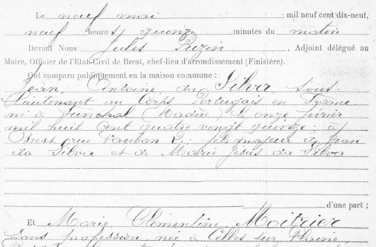 Le 9 mai 1919, c’est le Sous-Lieutenant du CEP Jean Antoine da Silva (écriture francisée de João António da Silva) qui se marie avec Marie Clémentine Moitrier. Natif de Funchal, Madère, il est dit fils de Jean et de Marie de Jesus da Silva. Ce nom de famille Da Silva a explosé dans la région parisienne et le nord de la France à partir de l’arrivée des Portugais en France pour la Guerre et la Reconstruction après-guerre des zones détruites.
