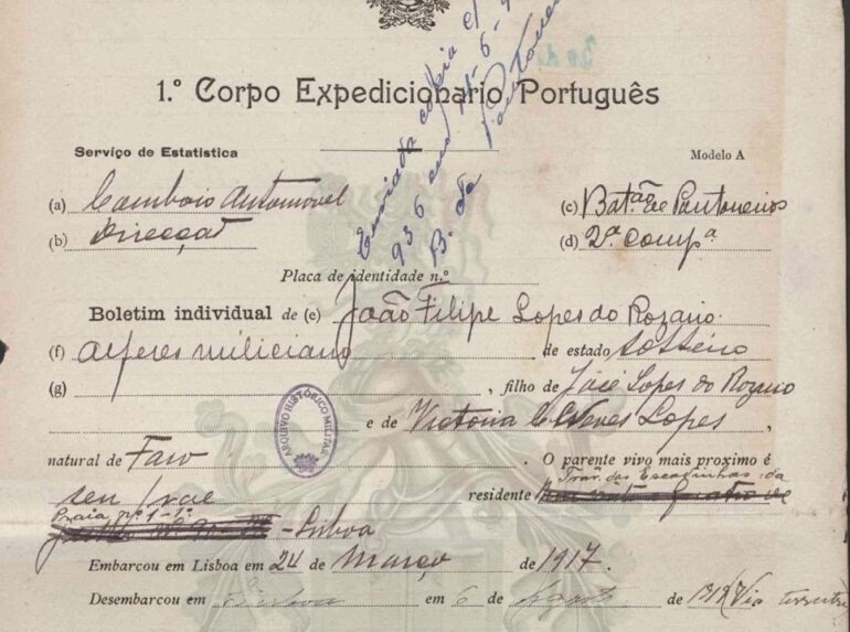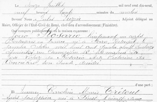 Le 12 juillet 1919, le Lieutenant milicien du CEP João Rosário (João Filipe Lopes do Rosário, selon le bulletin militaire) épouse Jeanne Caroline Trétout. Natif de Faro, il est fils de José Lopes do Rosário et de Victorine da Conceição. Le nom de famille Rosário s’est peu implanté en France à l’époque. Il s’est développé à partir des années 1970.