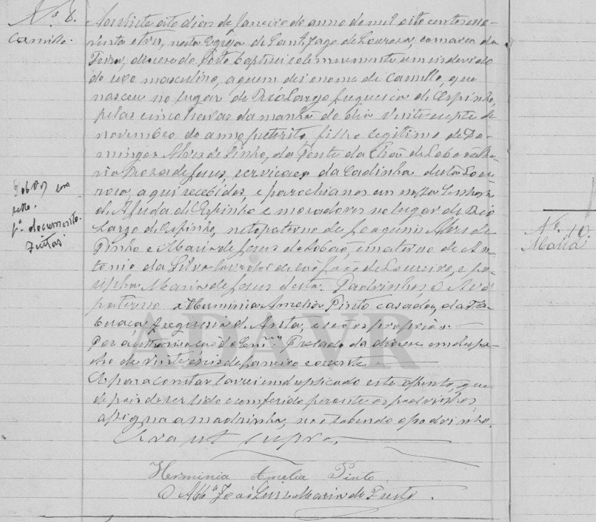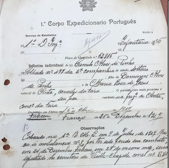 Le soldat s’appelait Camilo Alves de Pinho, né le matin du 20 novembre 1893 à Anta (Espinho, Aveiro) baptisé huit jours plus tard à Lourosa (Santa Maria da Feira,Aveiro). Il était fils de Domingos Alves de Pinho et Maria Rosa de Jesus Pinho.