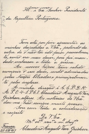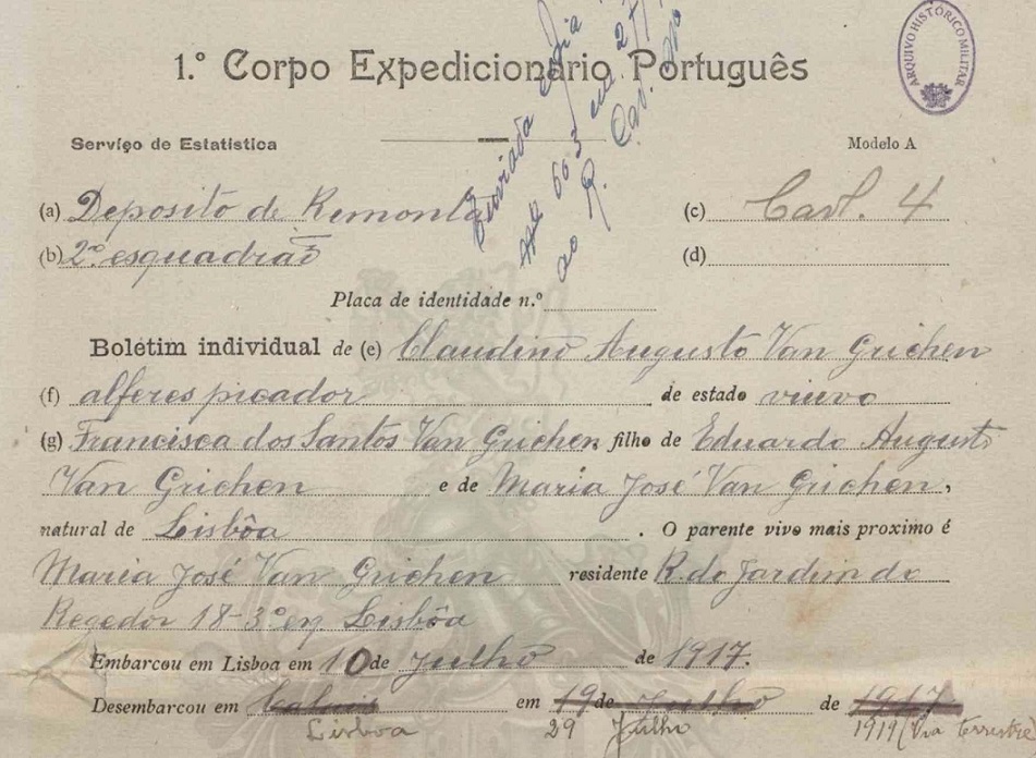 Claudino Augusto Van Grichen fait partie en 1913 d’un groupe de batteries d’artillerie à cheval. Avec le CEP, il embarque à Lisboa, en juillet 1917, vers la France. Il intégrera en tant que cavalier le 2ème escadron du dépôt de remonte (comme Mário da Cunha précédemment cité).
