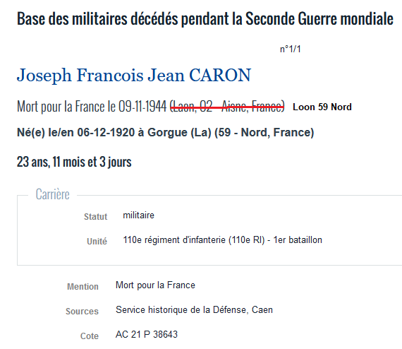 José Francisco Botas (1895-1965), ancien combattant du CEP pendant la I Guerre mondiale est démobilisé en France en août 1920 (lire ICI). De son union libre à La Gorgue avec une Française, naît en décembre 1920 un garçon illégitime qui sera soldat au 110ème Régiment d’Infanterie, sous le nom Joseph François Jean Caron (1920-1944), parfois appelé Capon dit Botas. Mort pour la France en novembre 1944, son nom figure sur le monument aux morts de la commune. Résistant lors de la II Guerre mondiale, il fait partie des troupes françaises de Libération, engagées en septembre 1944 au côté des Alliés pour libérer Dunkerque des Allemands.