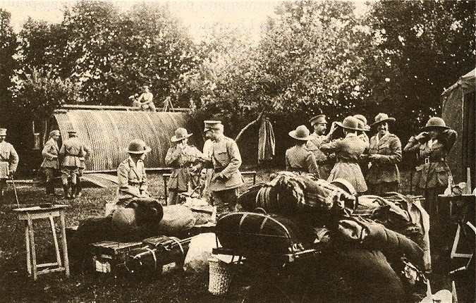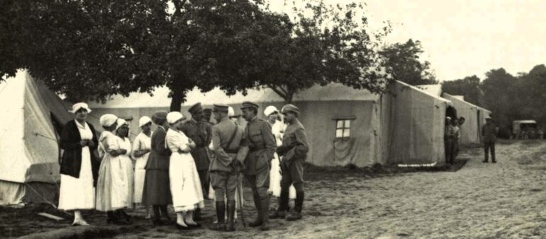 A l’été 1918, les quelques 300 habitants d’Herbelles ont dû voir avec surprise s’élever, au milieu des arbres, un hôpital fait de grandes tentes Bessonneau, de demi-lunes (lire ICI), de petites tentes et constater les va-et-vient des médecins, des infirmières portugaises et des transports automobiles de malades et blessés. Cette curiosité de la population civile est visualisée par un cliché du photographe officiel Arnaldo Garcez (lire ICI), 2 jeunes garçons français suivis probablement de leur mère, semblaient désireux de savoir ce qu’il y avait derrière les grands murs végétaux. Les structures de soins pour blessés et convalescents portugais avaient été abordées ici (lire ICI).