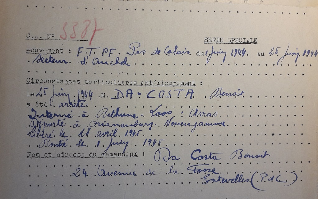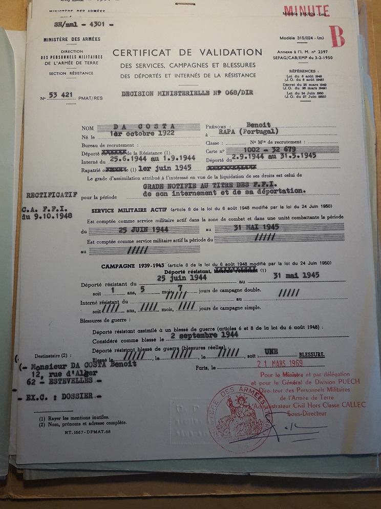 L’attestation de Benoît da Costa Araújo et la deuxième de ses deux responsables, ont été établies afin qu’il reçoive la Carte de déporté résistant.