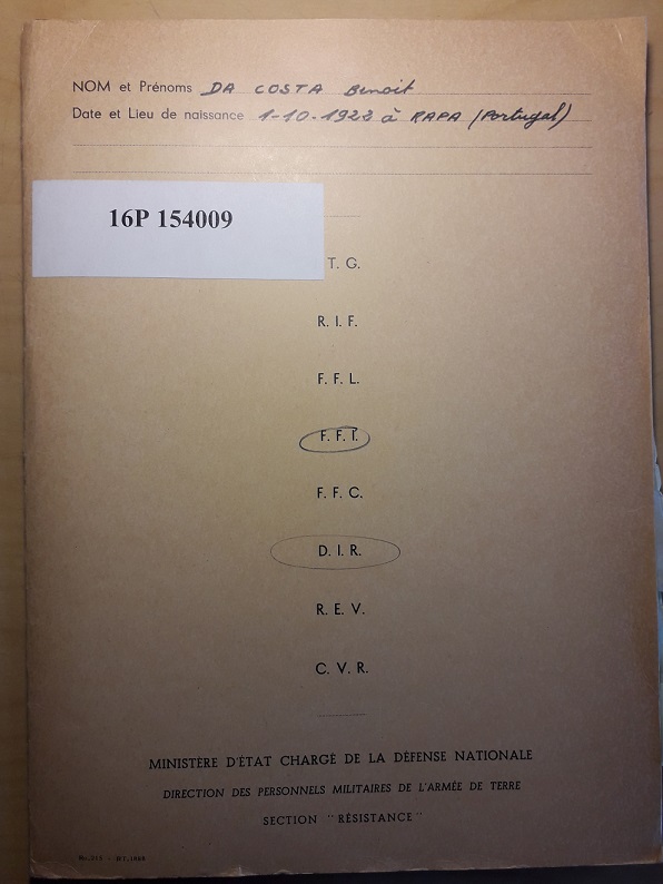 Benoît da Costa Araújo reçoit la Carte de déporté résistant le 19 août 1960, après dossier déposé dans lequel il décrit ses actions, attestées aussi par deux supérieurs.