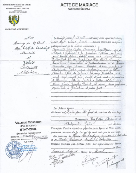 Benoit est né à Rapa (Celorico da Beira), le 1er octobre 1922. Il s’est marié avec Antoinette João, à Meurchin, dans le Pas-de-Calais,le 29 avril 1948 (*).