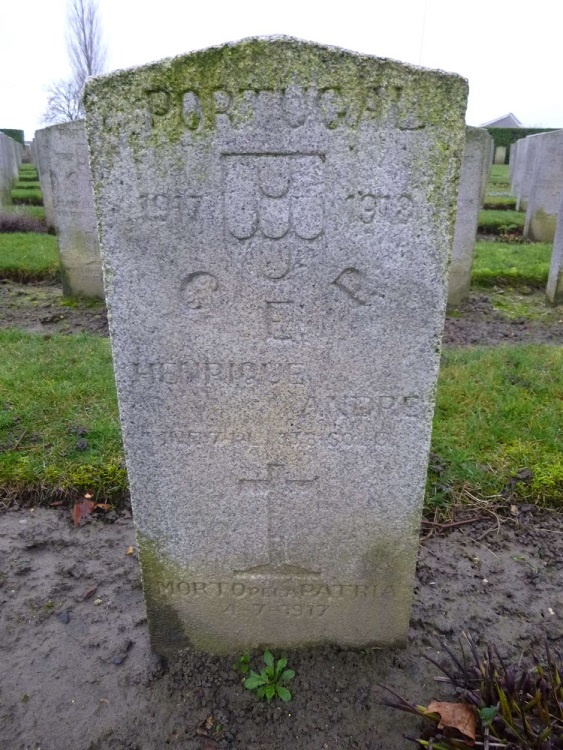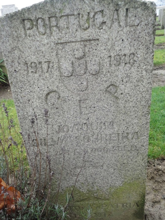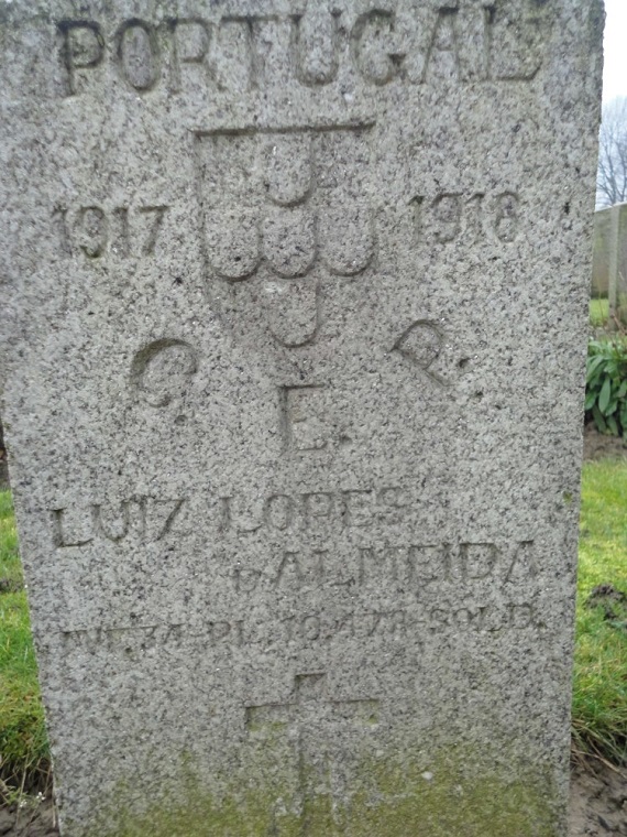 Luis Lopes Almeida faisait partie du Bataillon d’infanterie 34, matricule 9.229. Au moment de l’embarquement de Lisboa, le 19 janvier 1917, il était célibataire, fils de José Almeida et Maria José, est né à Silva de Cima (Sátão). Blessé en combat le 12 juin 1917, il meurt le lendemain. Inhumé dans un premier temps dans le Cimetière de Merville, carré 1, ligne B, tombe 28, il sera exhumé, puis réinhumé à Richebourg, carré 1, ligne A, tombe 1, document exhumation/inhumation numérotée 1.000.