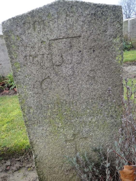 Enterré à Merville, carré 1, ligne B, tombe 32. Il sera exhumé, puis réinhumé à Richebourg, carré 1, ligne A, tombe 4, document exhumation/inhumation 1003. Actuellement à Richebourg il occupe le carré A, ligne 8, tombe 18.