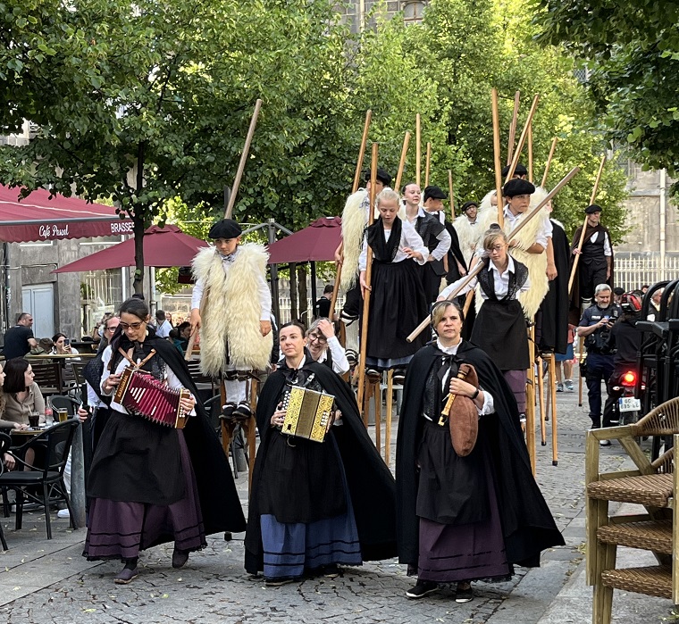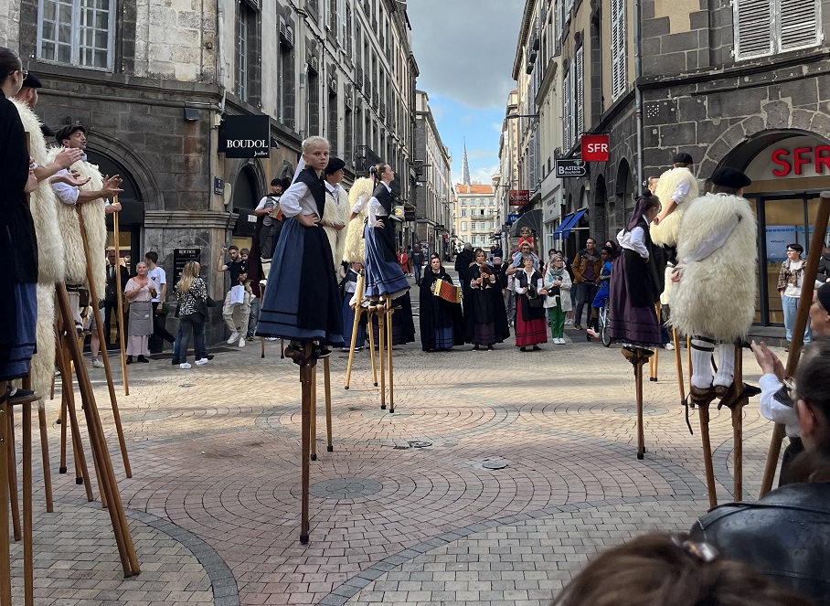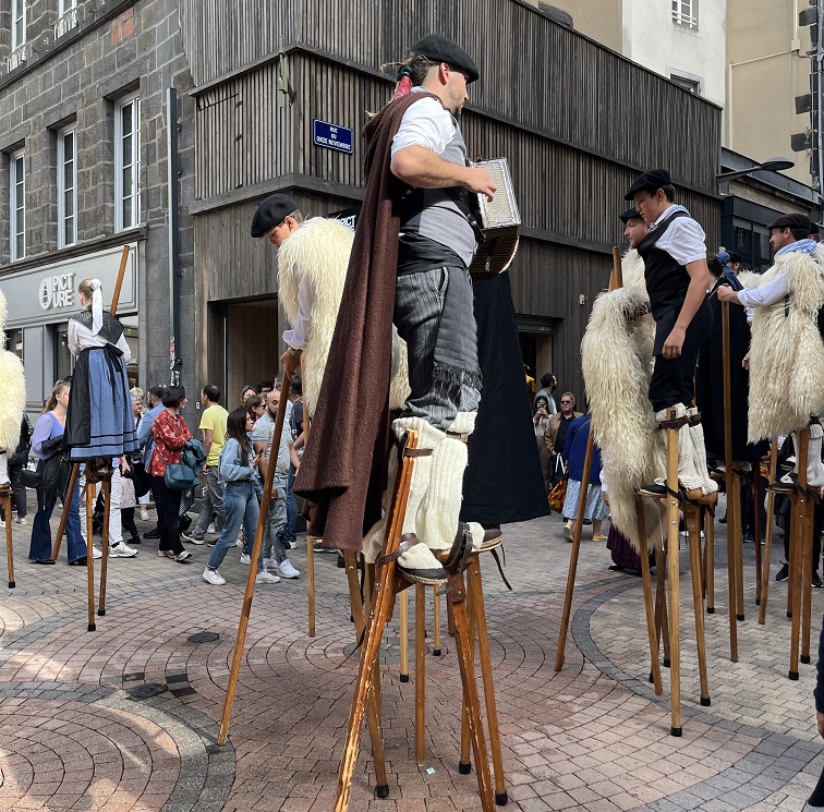Habillés en berger et bergères avec leurs vestes en fourrure de mouton, les échassiers, tel qu’on les appelle, n’ont pas pour fonction d’effrayer les Auvergnats, mais nous viennent des Landes, où leurs échasses servaient à l’origine d’escabeau pour les paysans désireux de surveiller leur bétail, dans les champs marécageux landais. Cela leur permettait de garder leurs pieds aux secs tout en observant leurs bêtes.