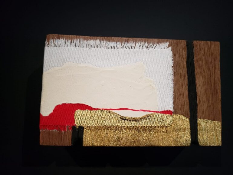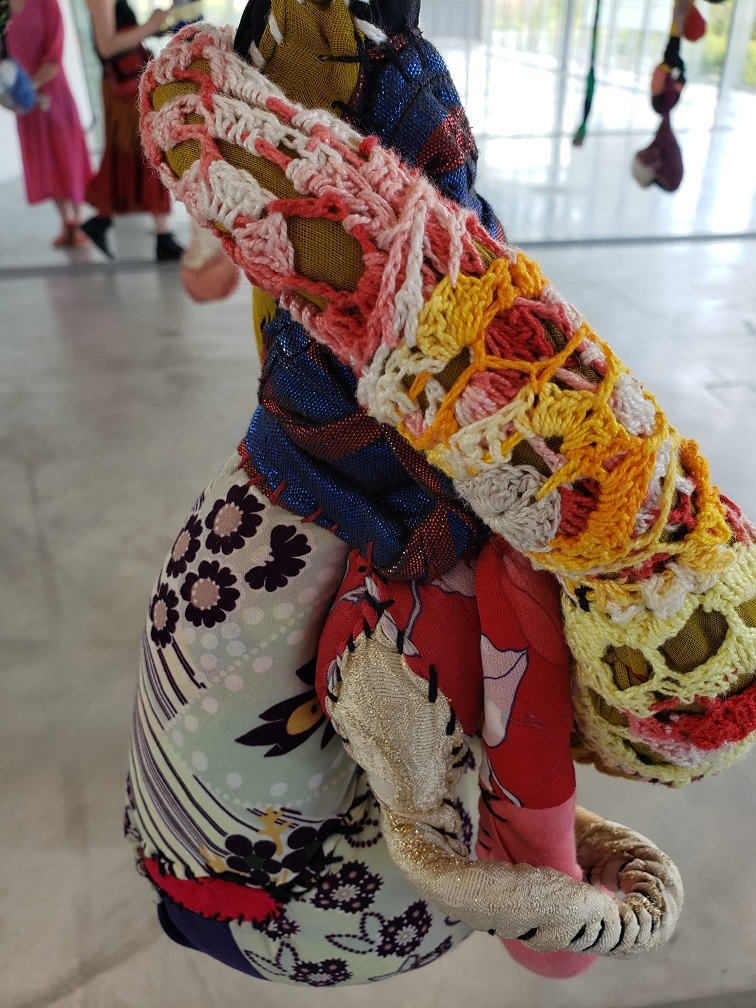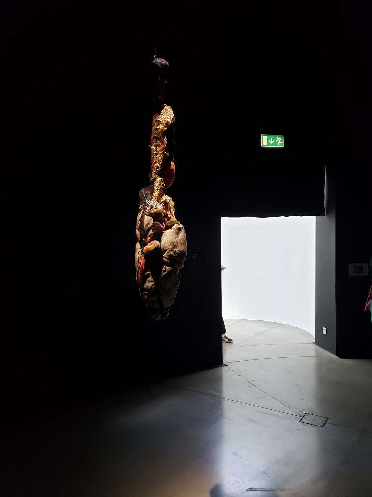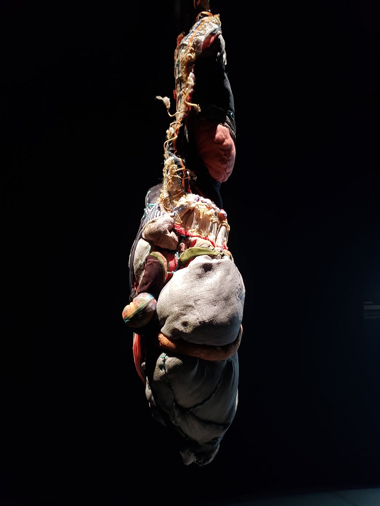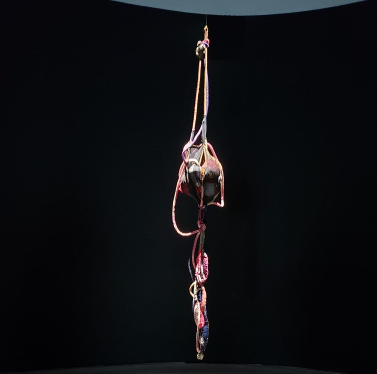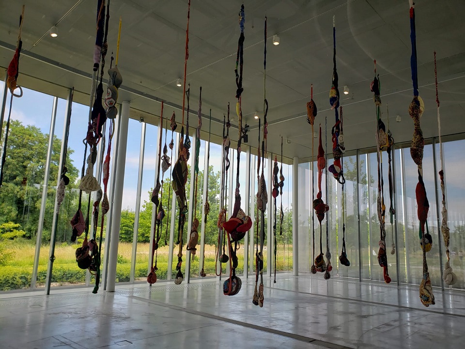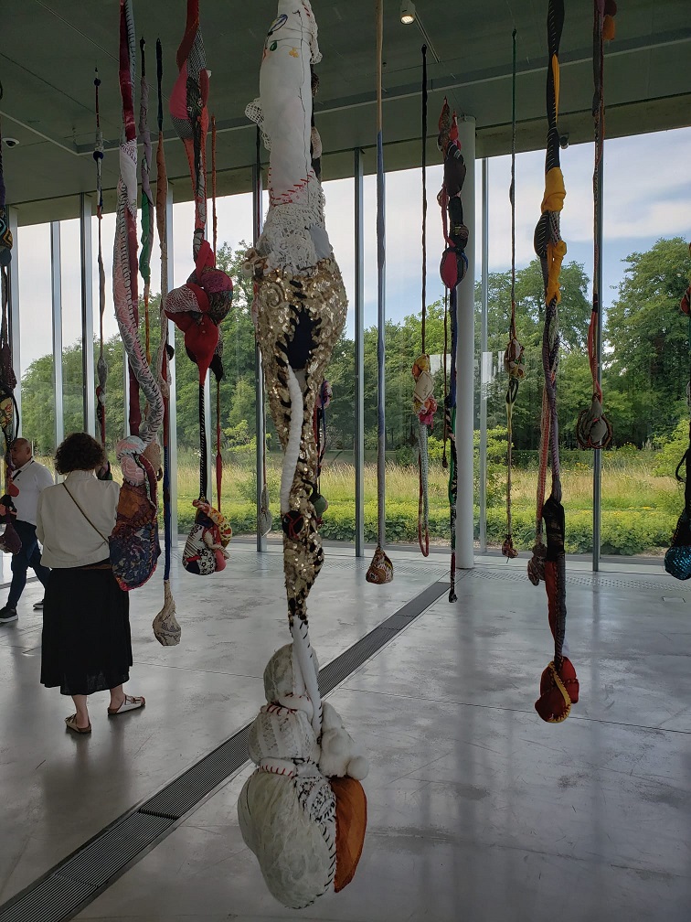 Arrivée dans la grande salle, appelée Pavillon de Verre, dans laquelle la «Symphonie des couleurs» est exposée, on est surpris par l’immensité de la pièce qui baigne dans la lumière venue de l’extérieur du musée. Presque au centre de cette pièce, on rentre dans une salle totalement sombre, les œuvres exposées de Sónia Gomes y sont mises individuellement en évidence par la lumière projetée sur elles… parfois l’ombre se crée.