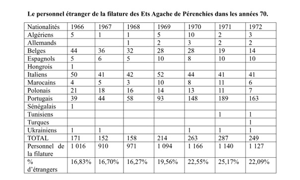 D’une manière générale, les travailleurs étrangers ont très peu de chance d’acquérir ou d’améliorer leurs connaissances professionnelles chez nous car, bien souvent, ils sont employés la nuit, à des postes de manœuvres spécialisés comme cardeur ou fileur. Néanmoins, quelques travailleurs étrangers ont accédé au poste de surveillant après un certain temps de présence dans l’entreprise entre 12 et 14 mois.