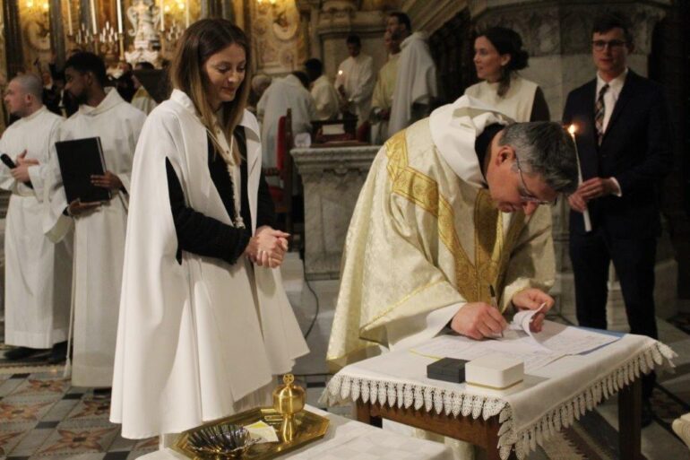 Raquel Manon Ferreira, com 28 anos de idade, recebeu durante a cerimónia da Vigília Pascal no sábado dia 30 de março, na Basílica de Fourvière, os sacramentos do Batismo e da Primeira Comunhão.