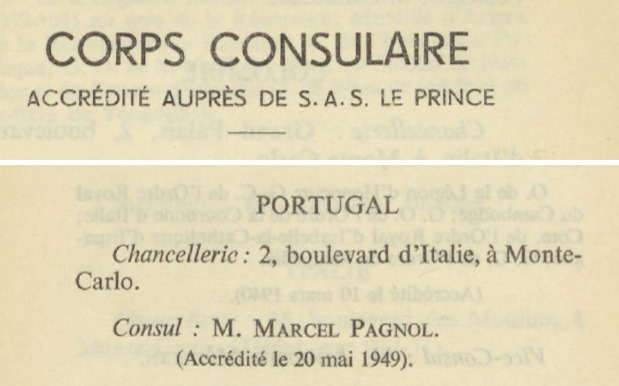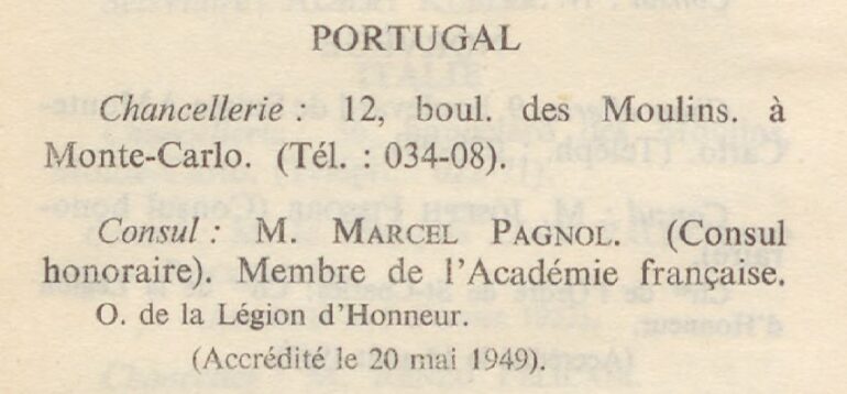Primeiro “Cônsul de Portugal” nos anuários oficiais do Principado, de 1950 a 1952, Marcel Pagnol aparece depois como “Cônsul Honorário” nos anuários de 1953 a 1955. A morada já era 12 boulevard des Moulins, em Monte-Carlo.