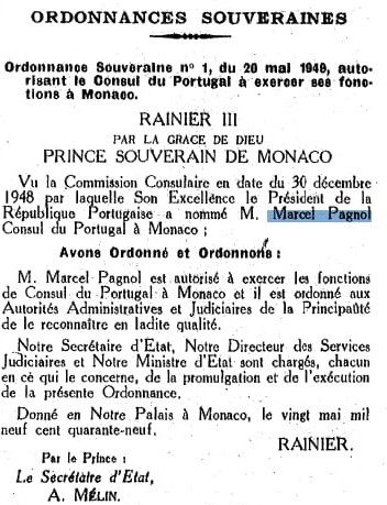 Foi em 20 de maio de 1949 que o Príncipe Rainier emitiu uma Portaria Soberana autorizando o Cônsul de Portugal a exercer as suas funções no Mónaco. “O Sr. Marcel Pagnol está autorizado a exercer as funções de Cônsul de Portugal no Mónaco e ordena-se que as autoridades administrativas e judiciais do Principado são obrigadas a reconhecer-lhe esta qualidade. O nosso Secretário de Estado, o nosso Diretor dos Serviços Judiciais e o nosso Ministro de Estado são responsáveis pela promulgação e execução desta Portaria” lê-se no Journal du Monaco de 30 de maio de 1949.