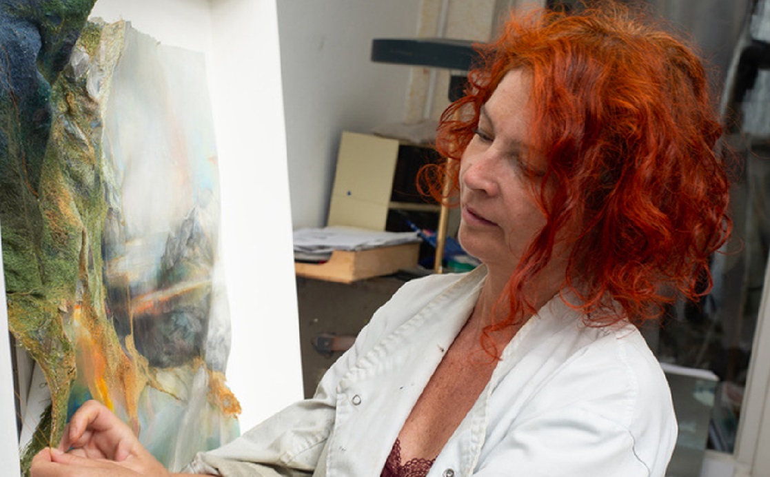 Dans ses œuvres, le paysage est traité comme un motif, recomposé à travers des coutures qui ajoutent une dimension organique et sensorielle.