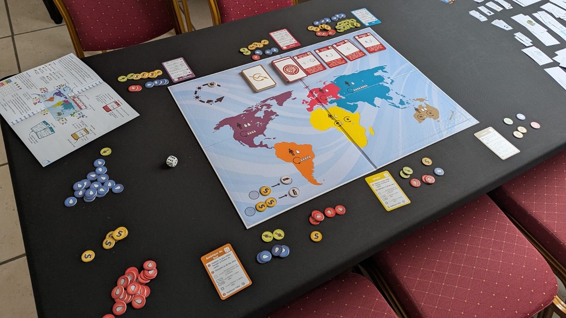 Revenons au jeu et aux enjeux. Font partie du jeu : un plateau mondial et des cartes. Les joueurs peuvent être de 2 à 6.