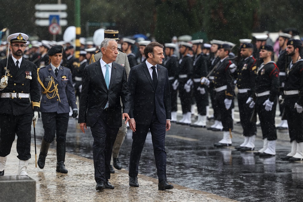O Presidente francês, Emmanuel Macron, foi recebido ontem de manhã com honras militares pelo seu homólogo português, Marcelo Rebelo de Sousa, na Praça do Império, em Lisboa, onde chegou com um atraso de mais de 30 minutos.